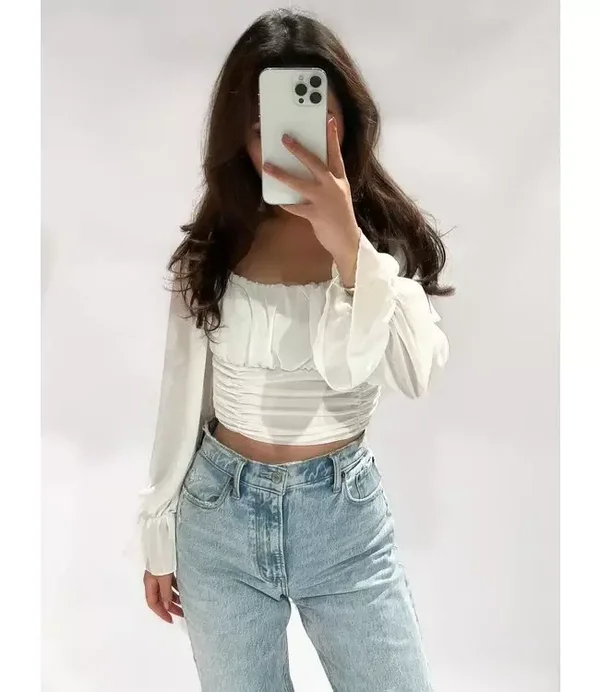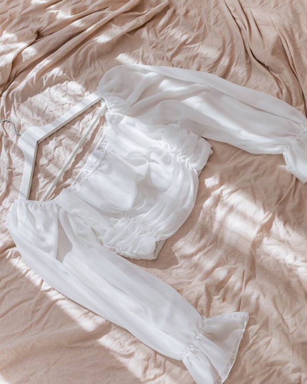 The Alyssa top is the perfect mix between cute and classy! You can wear this to so many occasions and style endlessly! The front and sleeves are a blouse material, and the back side has a lot of stretch to it. There is also more elastic in the seams and sleeve cuffs, so it can comfortably be worn on & off the shoulder!