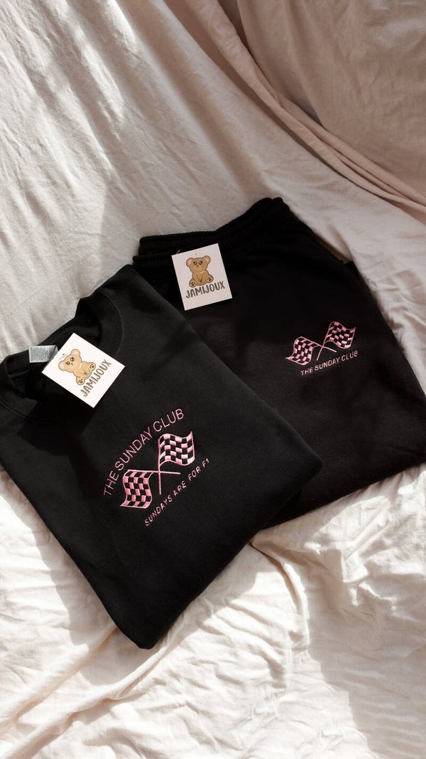 Calling the F1 fans once again with these matching joggers to our bestselling ''Sunday club'' design! This adorable design is a perfect smaller version to match, and can also be embroidered without the text if that is wished!