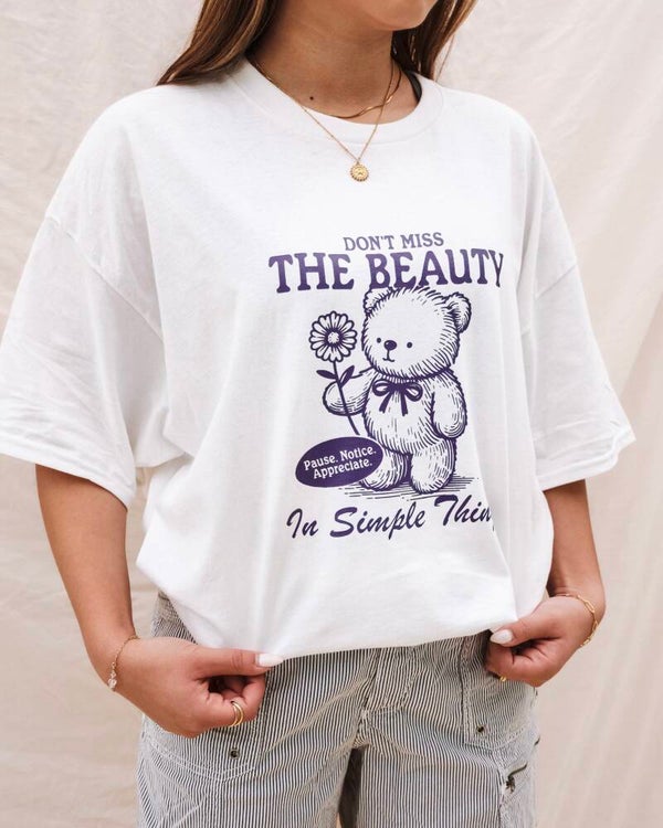 Celebrate the little things with our "Beauty In Simple Things" tee! This shirt features an endearing teddy, accompanied by a heartfelt message!