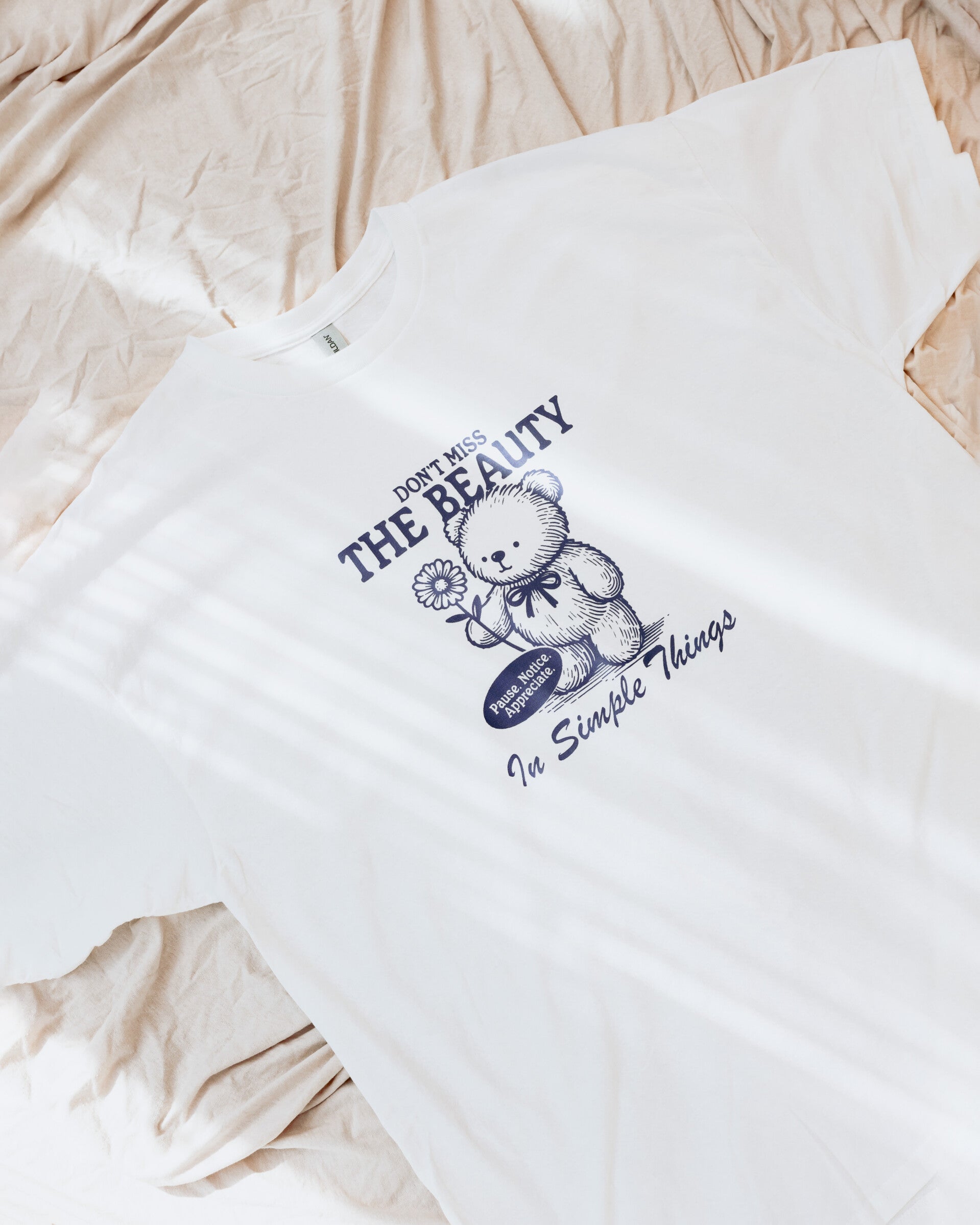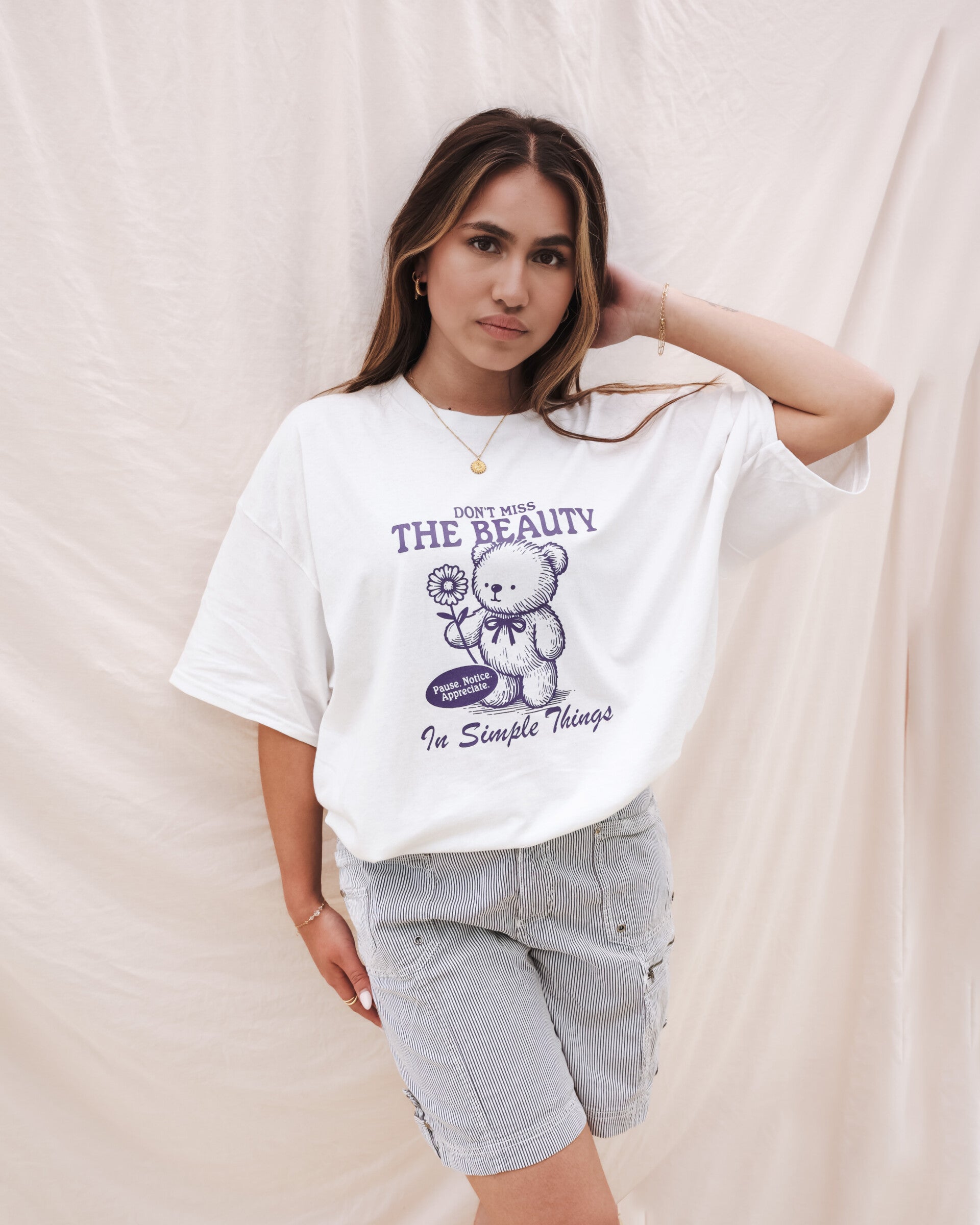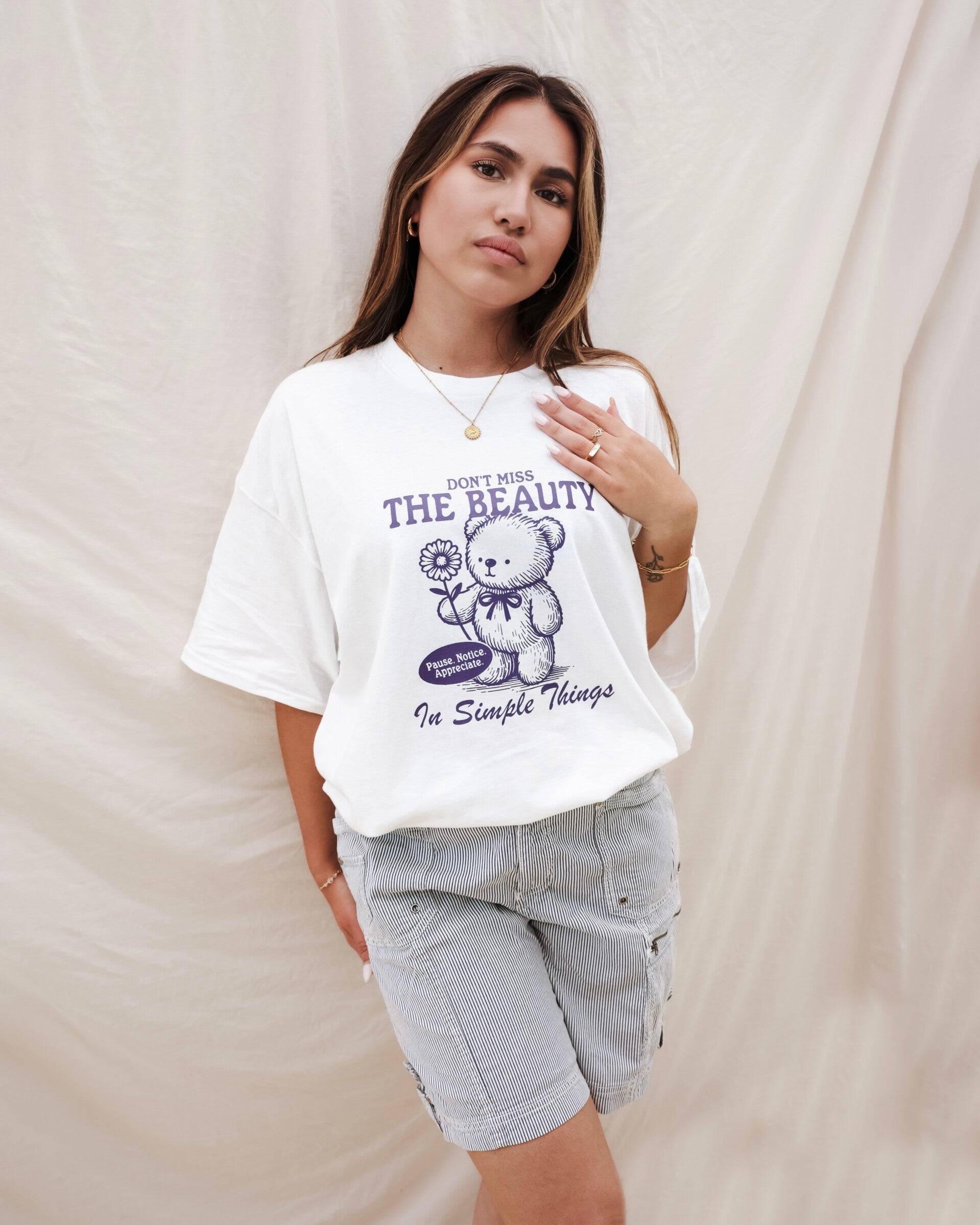 Celebrate the little things with our "Beauty In Simple Things" tee! This shirt features an endearing teddy, accompanied by a heartfelt message!