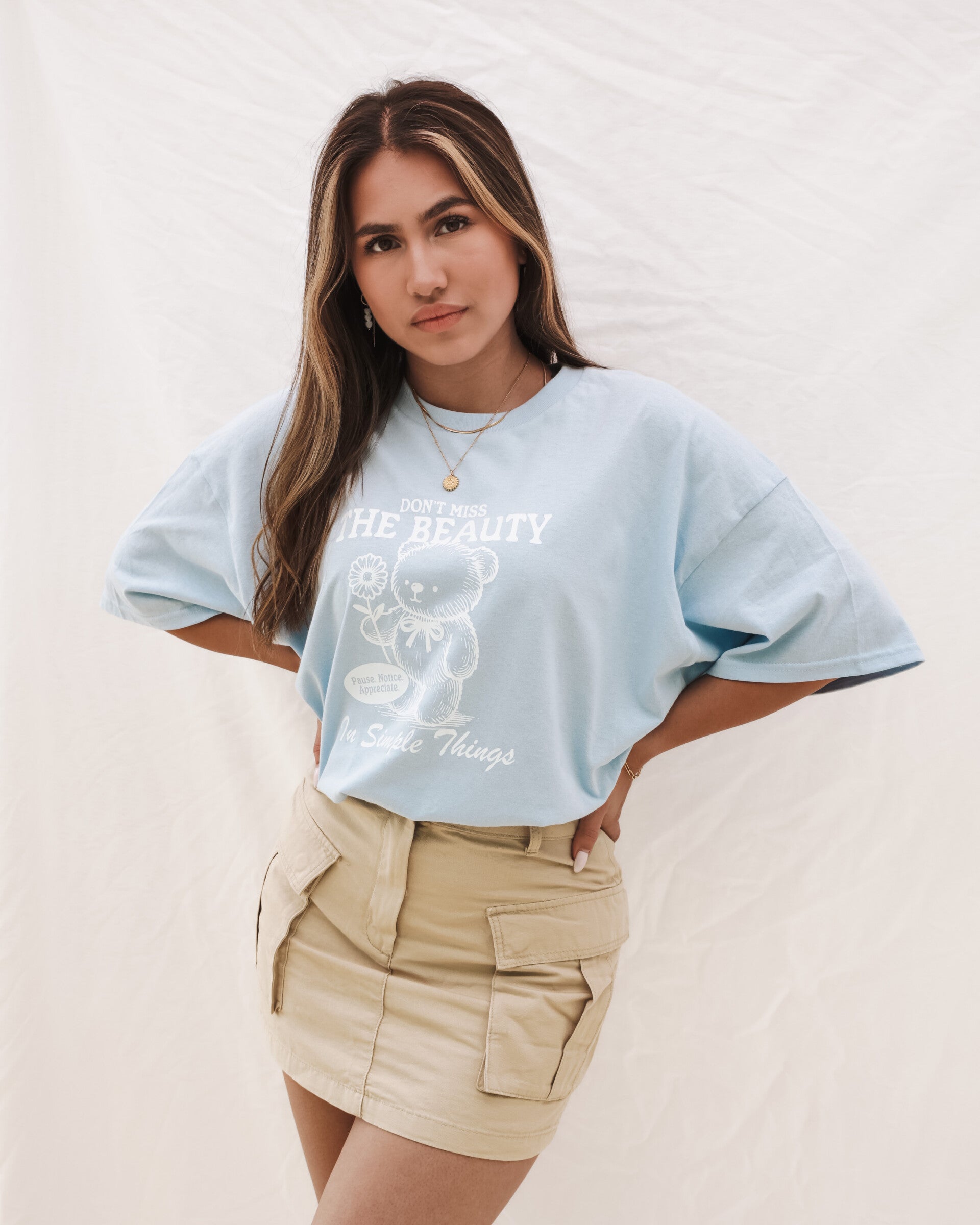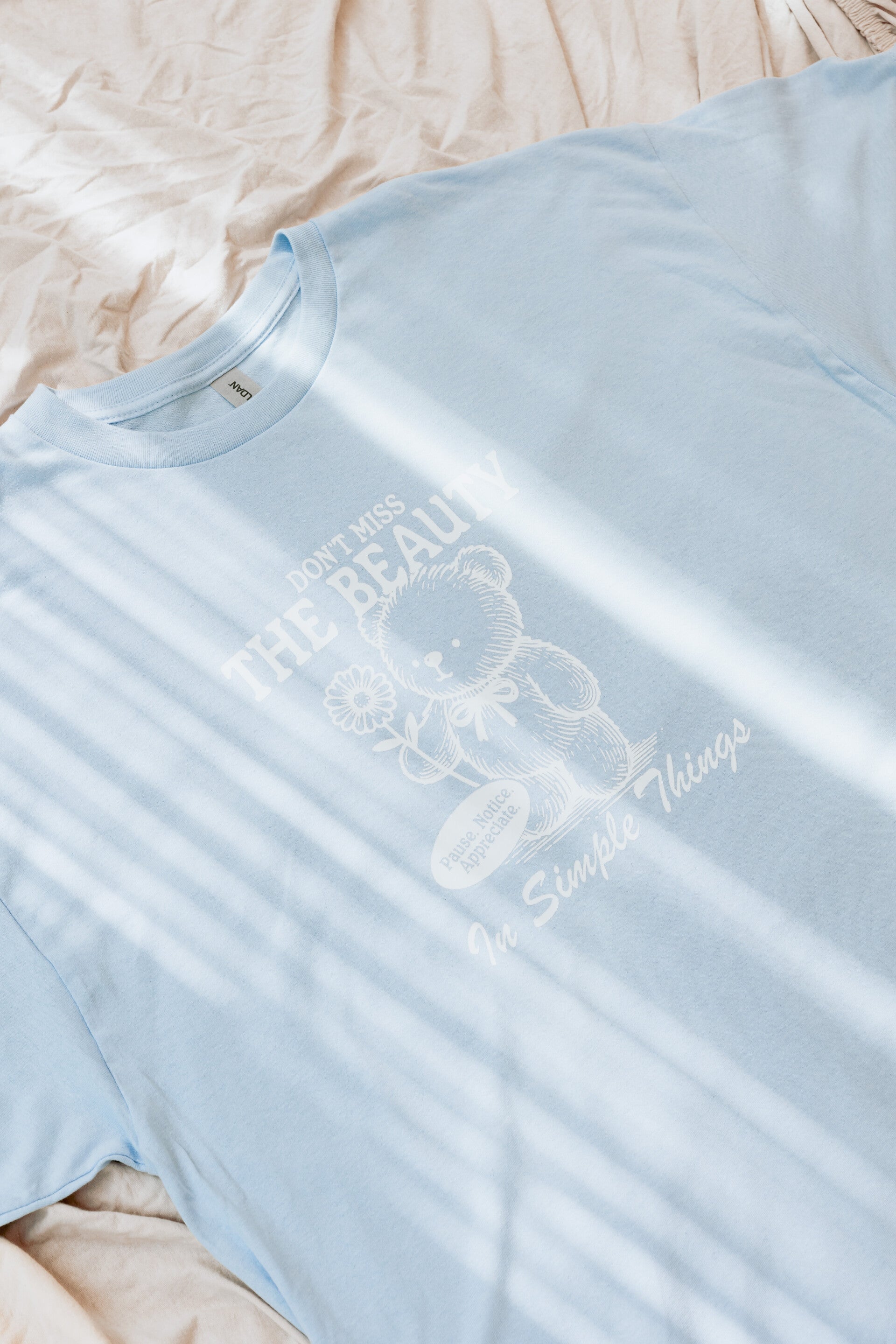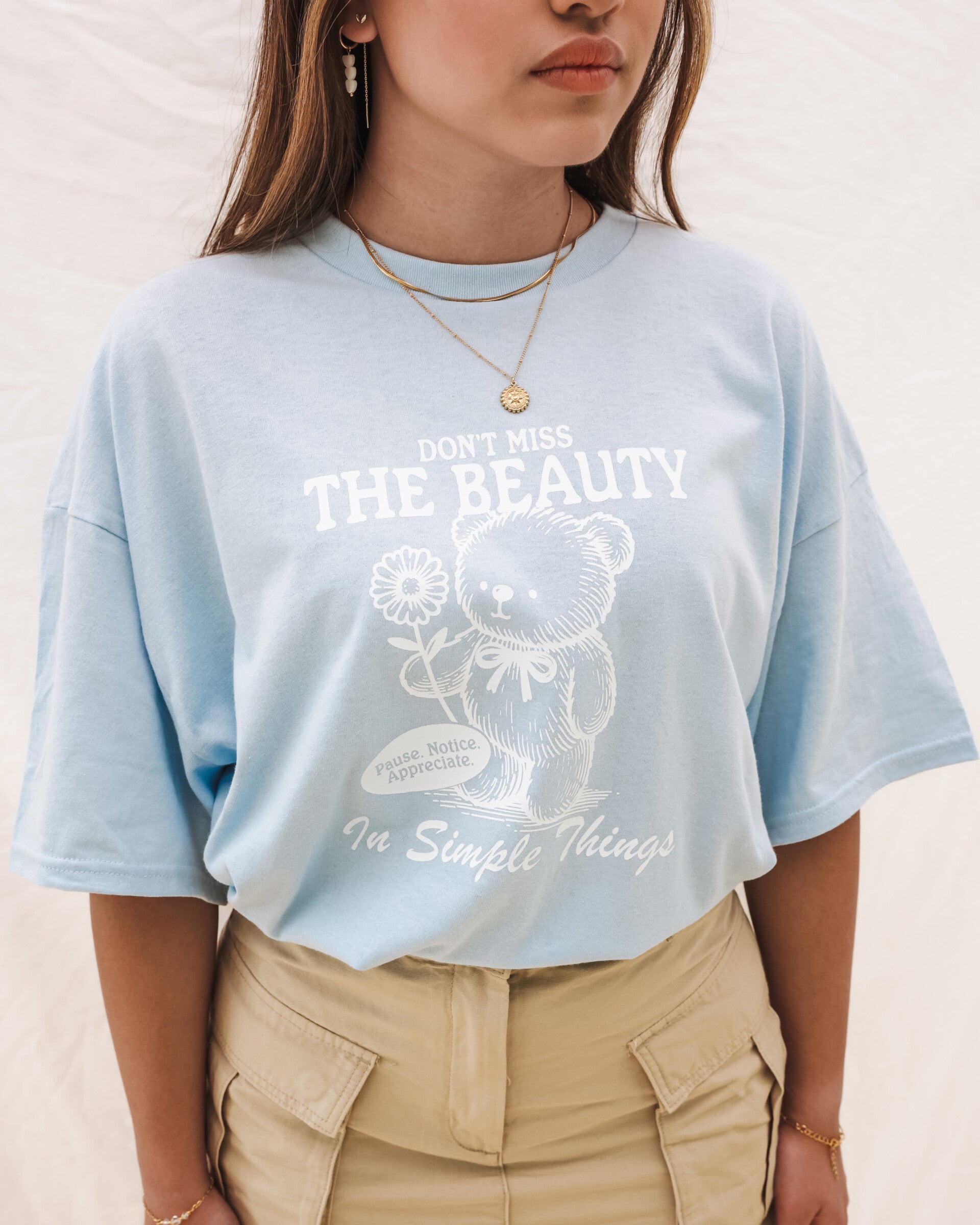 Celebrate the little things with our "Beauty In Simple Things" tee! This shirt features an endearing teddy, accompanied by a heartfelt message!