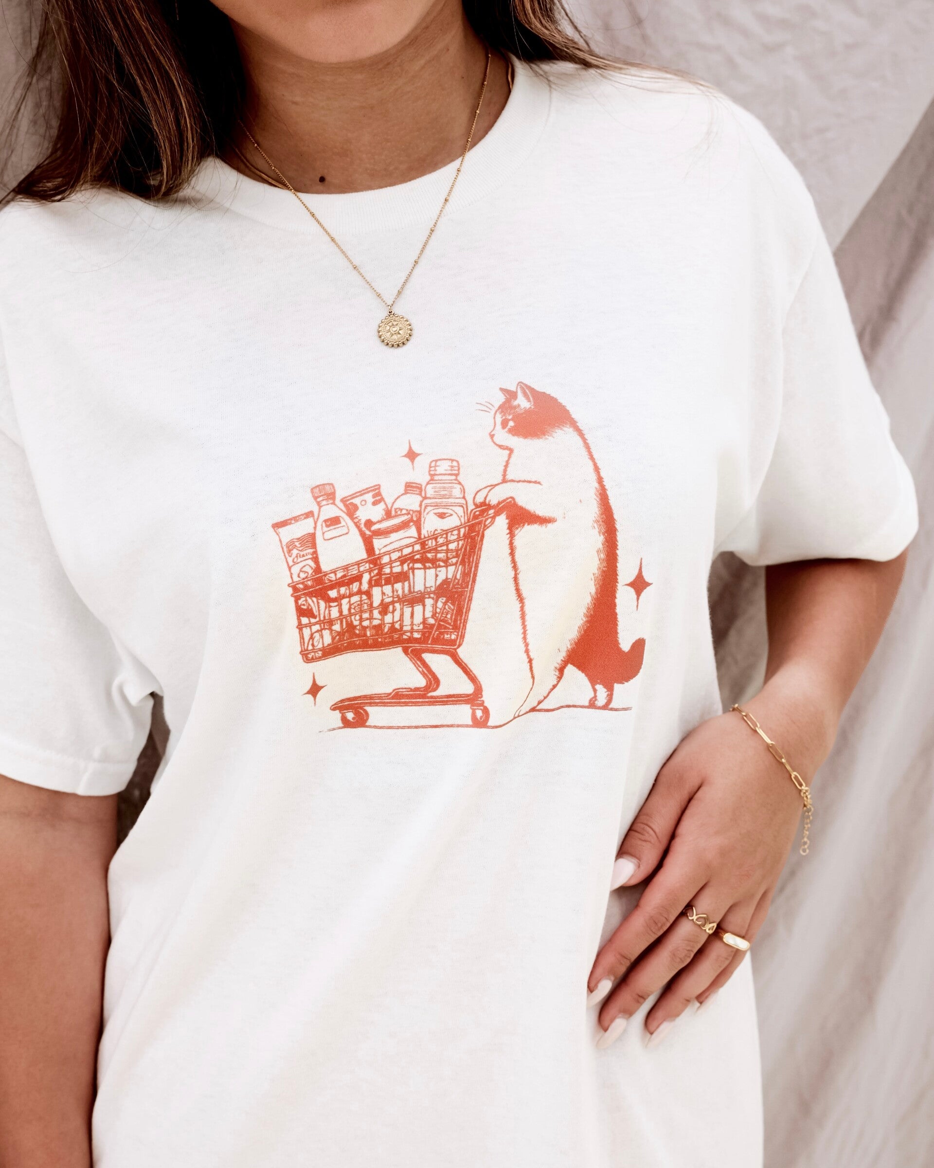 Add a playful touch to your wardrobe with our "Grocery kitty" shirt! This tee features a cat pushing a grocery cart filled with his favorite goodies!