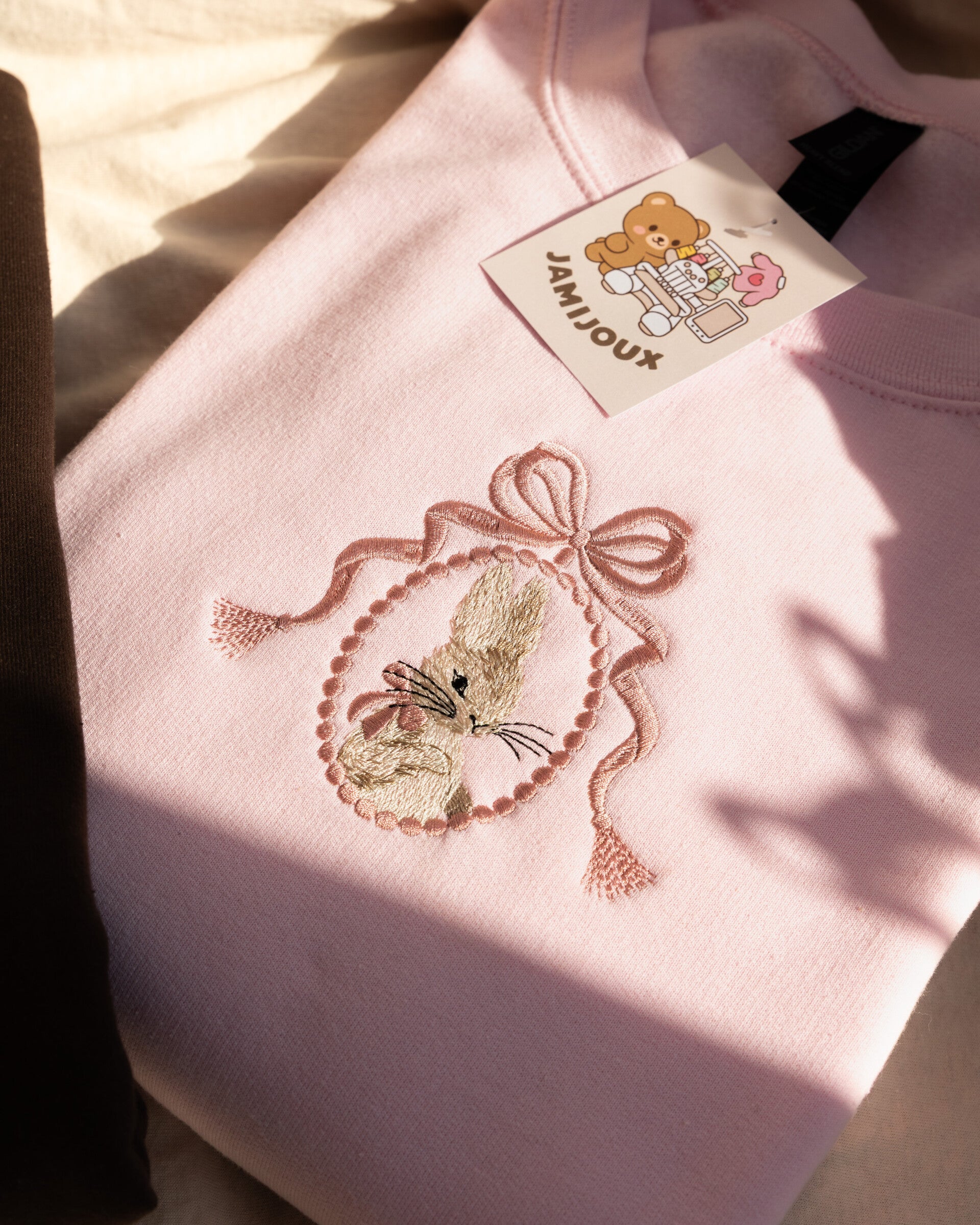 A little bunny with a touch of elegance! This delicate embroidery features a soft, fluffy bunny framed by a beaded oval, topped with a romantic bow, and flowy tassels! An adorably dreamy design for those who love a fairytale aesthetic!