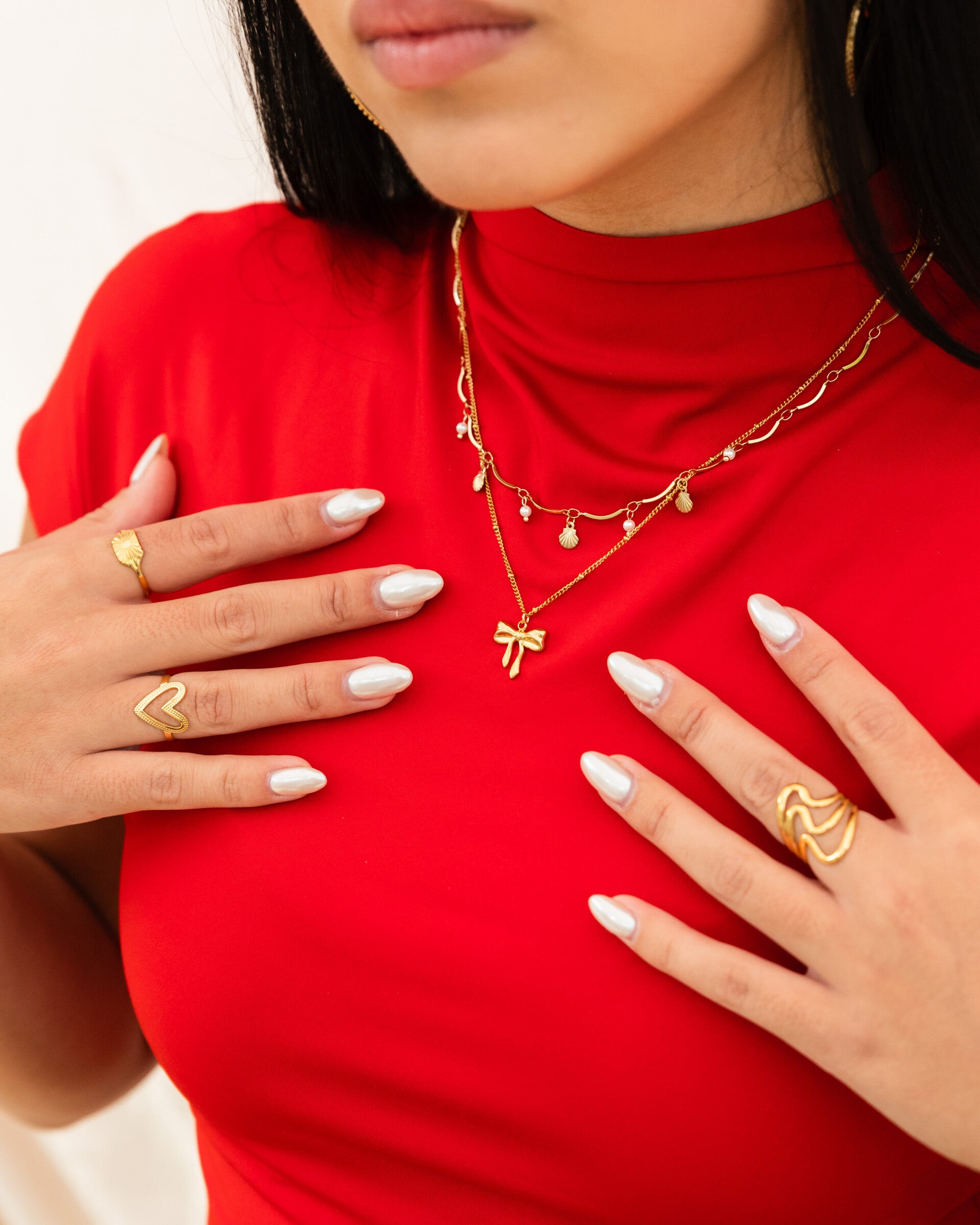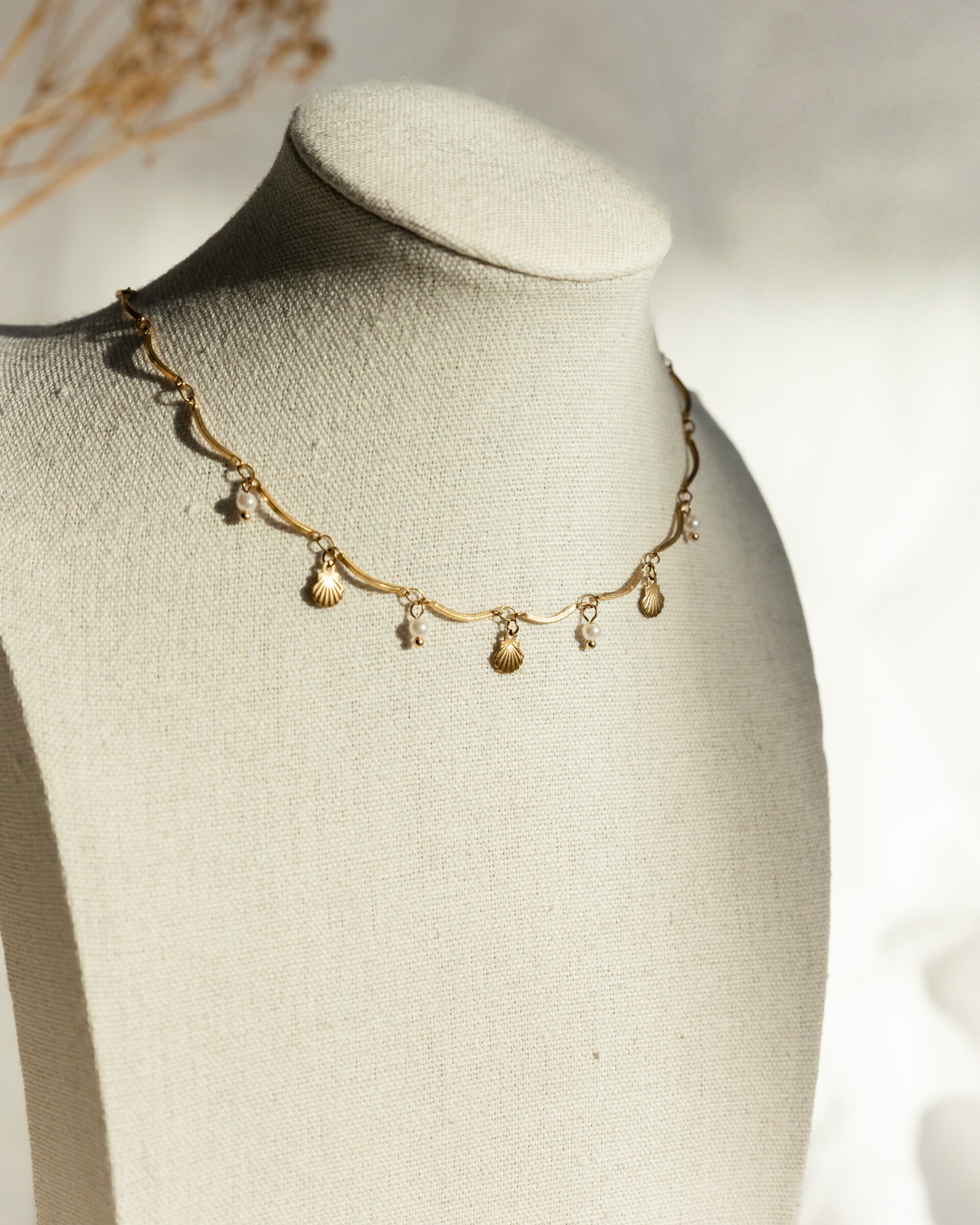 A delicate ocean-inspired piece! This golden chain is made of sleek, curved bars connected together, with a mix of small pearls and tiny shell charms in the center! Beachy vibes all year round! Only available in gold