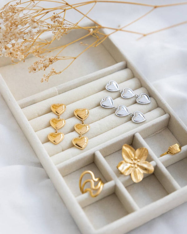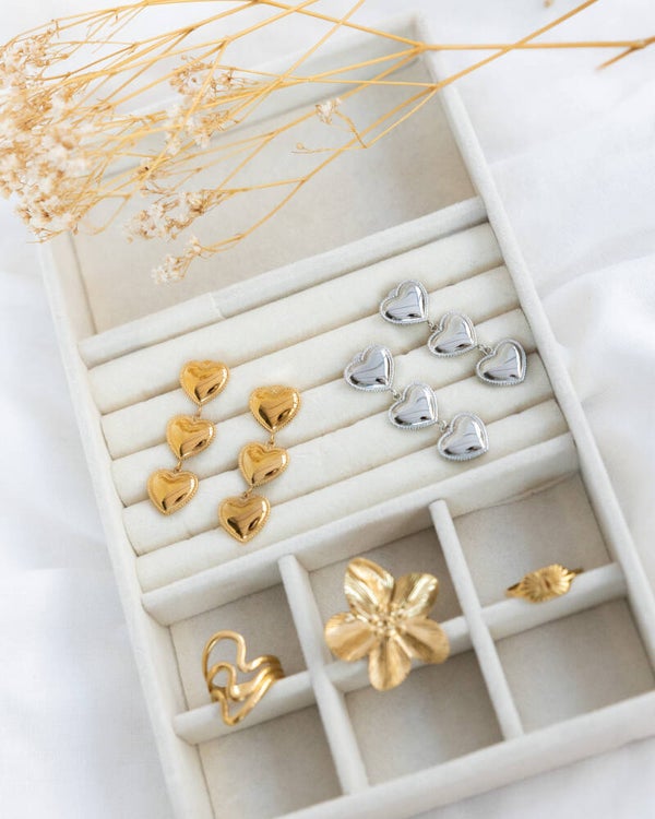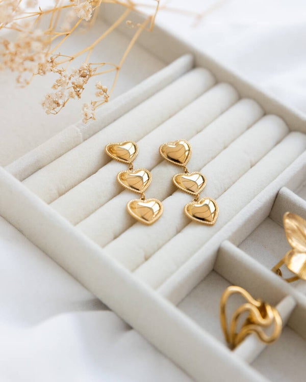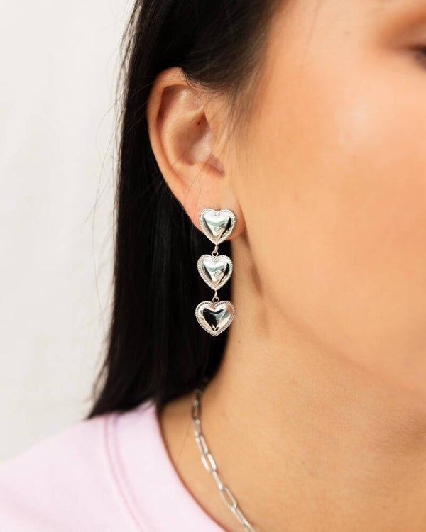 A single heart earring is cute, but three? Even better! These romantic dangle earrings feature three solid hearts hanging in a row, because you can never have too much love!