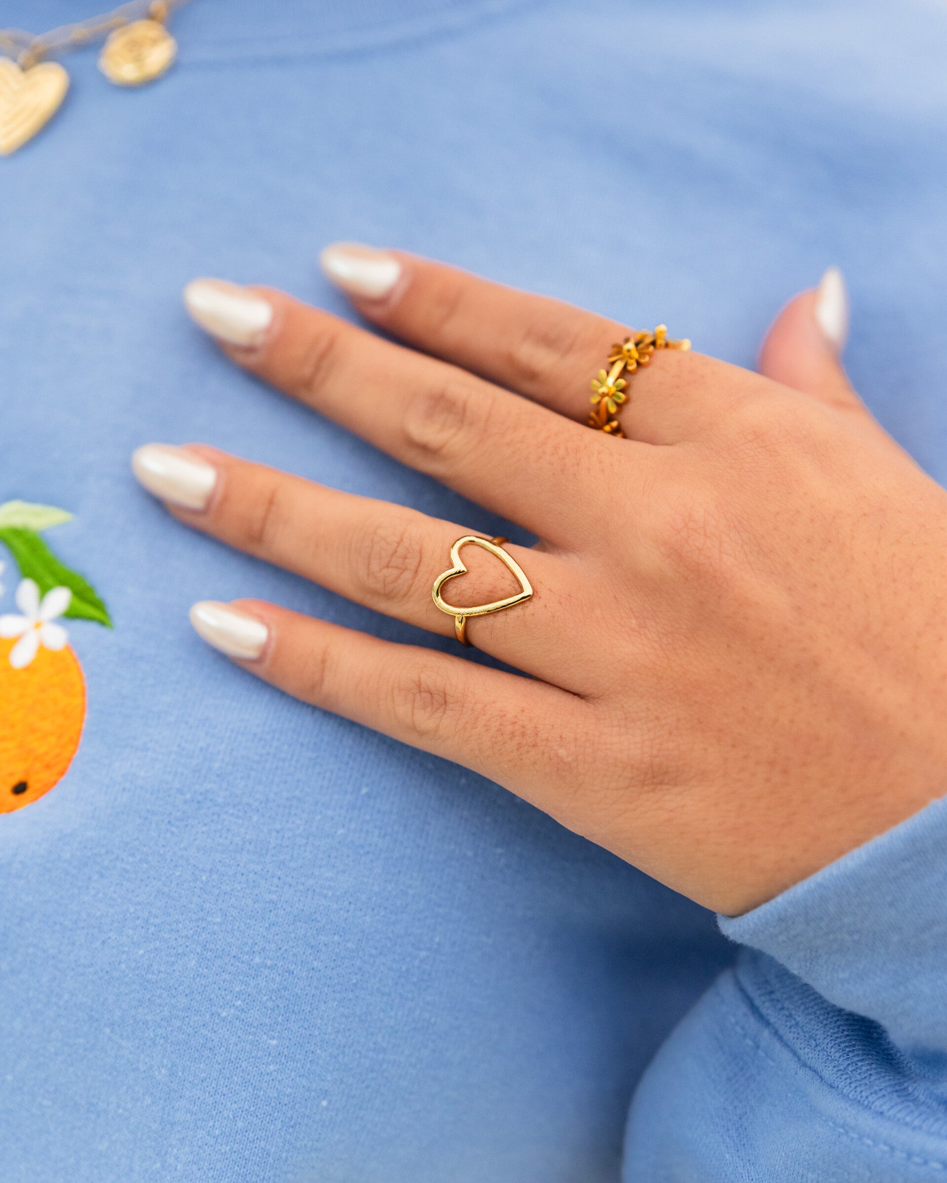 This ultra-thin ring features a delicate open heart outline, making it the perfect stacking piece or a subtle everyday favorite! Available in gold & silver.