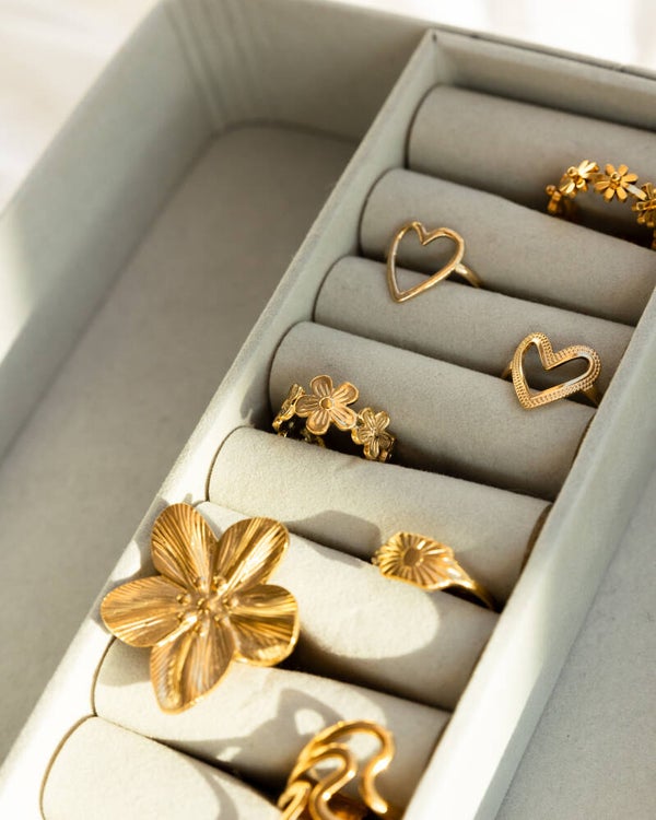 Dainty but detailed! The Petal chain ring has three delicate, slightly flatter flowers in a row, with the middle one a bit bigger than the rest, for the perfect center piece! Available in gold & silver.