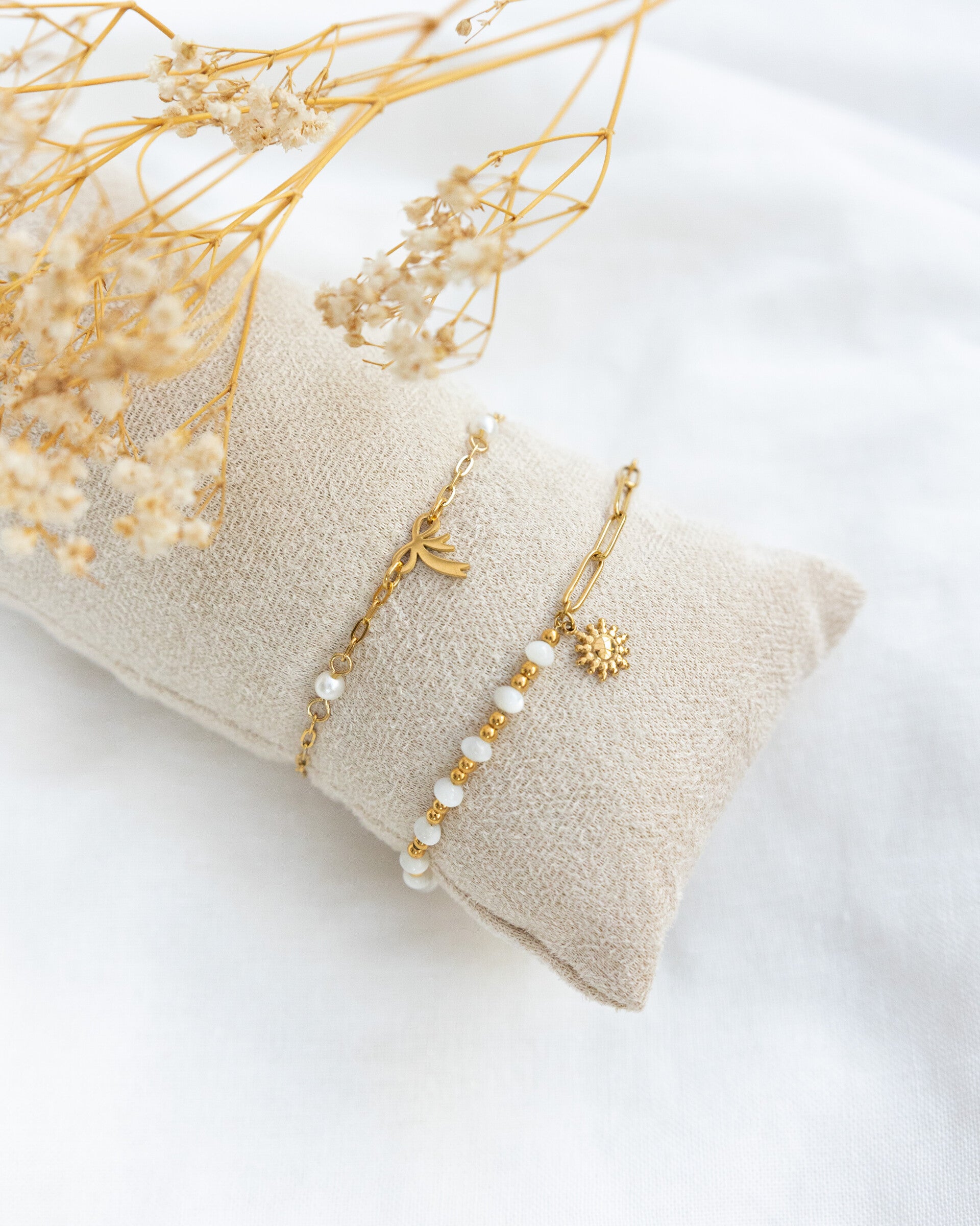 A little bit of sunshine on your wrist! This gold bracelet features a half-chain, half-beaded design, alternating between small gold beads and slightly larger white beads! The finishing touch? A tiny sun pendant right in the middle, shining bright! Only available in gold!