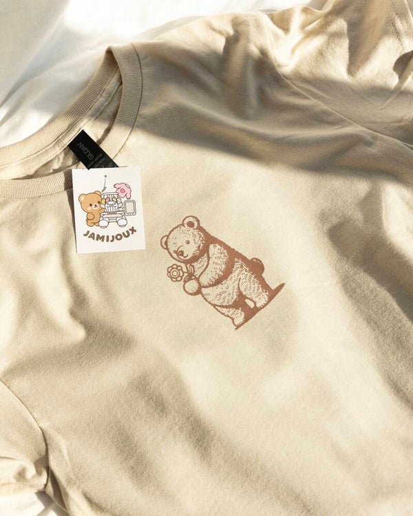 A tiny bear, a single flower, and a whole lot of charm! This simple yet adorable design captures a little moment of sweetness! Available as both a front print and a back print, so you can choose just how much attention this cutie gets!