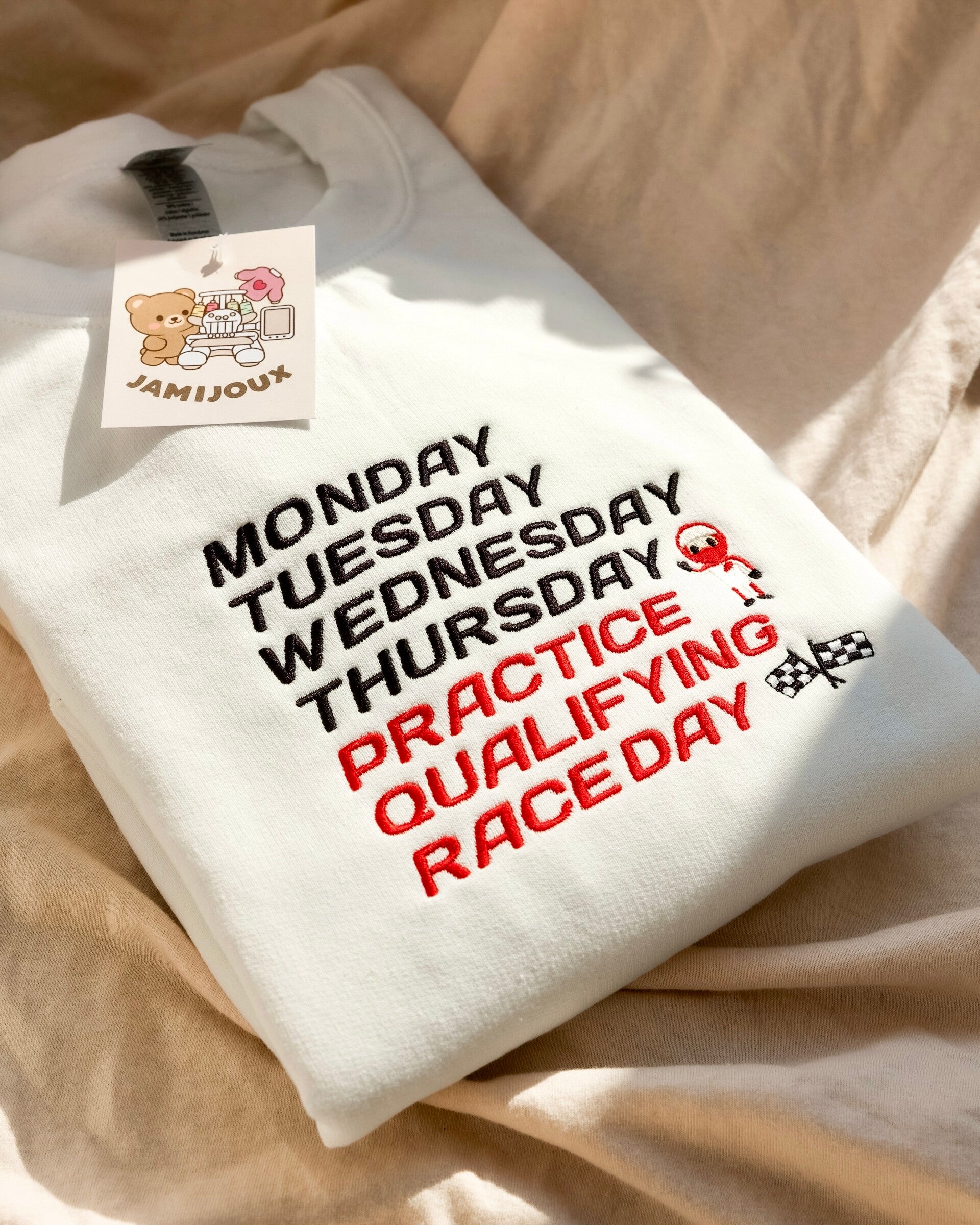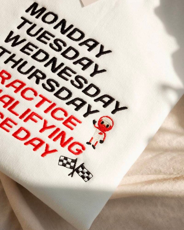 For those who live life by the F1 schedule! Monday to Thursday? Just background noise. But once the weekend hits, it's full focus! This design can be embroidered in english or dutch, with or without little driver & flag icons and in any font you like!