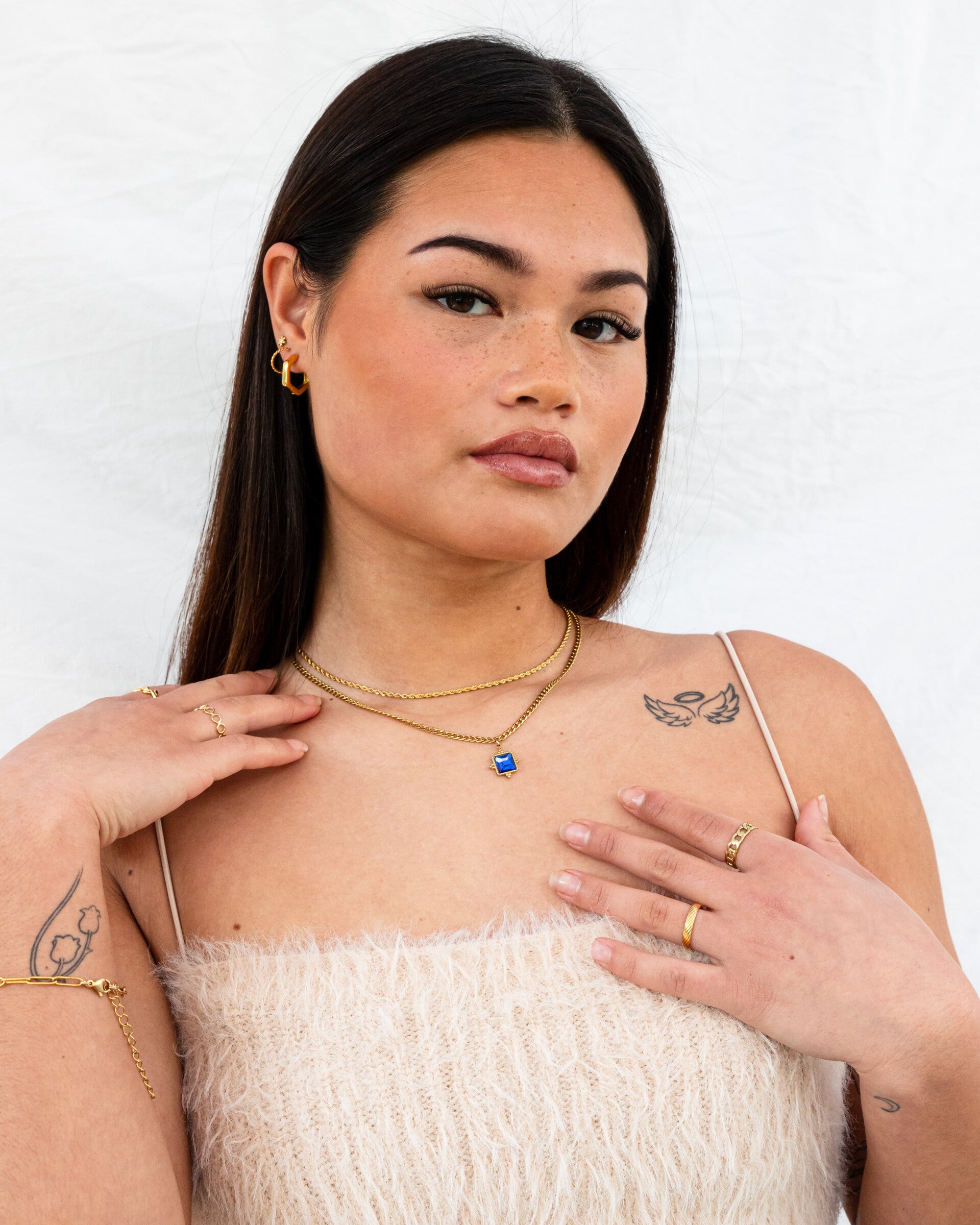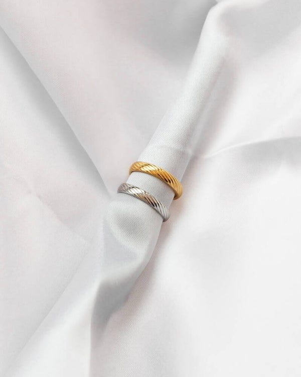 The Madison ring is a great basic ring for your ring stack! This stainless steel ring has an engraved twisted pattern and is fully adjustable to any ring size! Available in both gold & silver