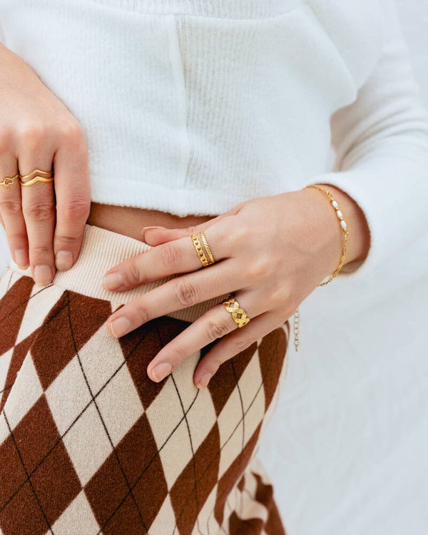 The Carmen ring is for our statement piece lovers! This comfortable ring is a stand out in your ring party! The Carmen ring has a unique engraved cross design. This sturdy ring is made with stainless steel materials and available in both gold & silver!