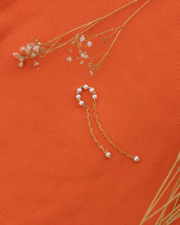 The Maia earcuff is a variation on the Mia earcuff. The same design with pretty little pearls & stainless steel beads. But added with some hanging chains to give the cuff even more dimension! Also super cute for when you can't have any piercings but want a dangling ear piece!
